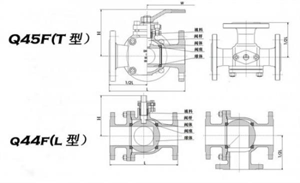 Q45F三通四密封球閥可分為L形和T形,L形(Q44F)三通球閥用于介質流向的切換,能使相互垂直的兩個通道連接;T形(Q45F)三通球閥用于介質分流、合流及流向切換。T形三通可以使三個通道相互連通或使其中的兩個通道連通。三通球閥一般采用兩閥座結構,亦可根據用戶要求采用四閥座結構。